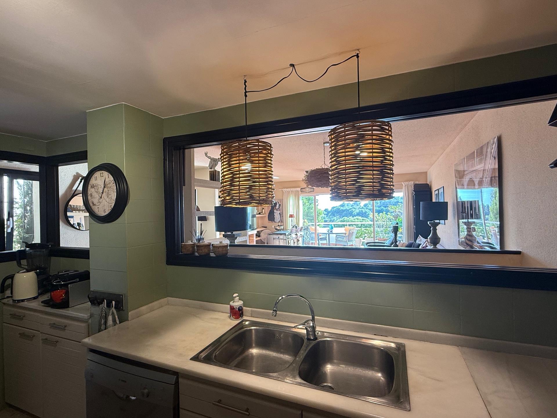 • cocina con vitrocerámica, horno eléctrico, microondas, lavavajillas, frigorífico-congelador, cafetera, hervidor eléctrico, batidora, tostadora y extractor de zumos