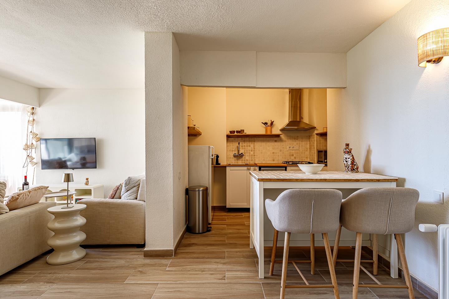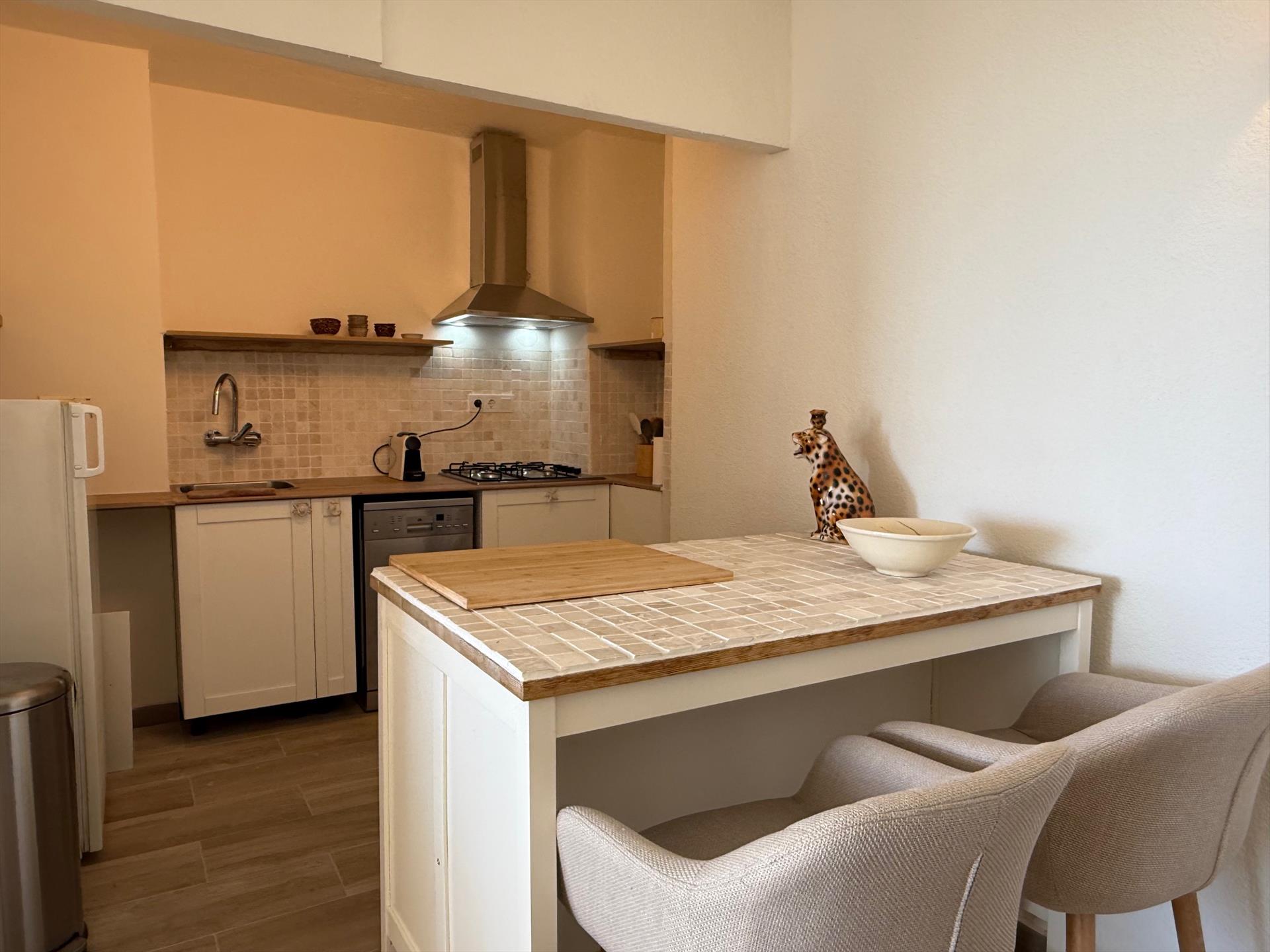 • cocina abierta con vitrocerámica, horno eléctrico, microondas, lavavajillas, frigorífico-congelador, cafetera, batidora, tostadora y exprimidor
