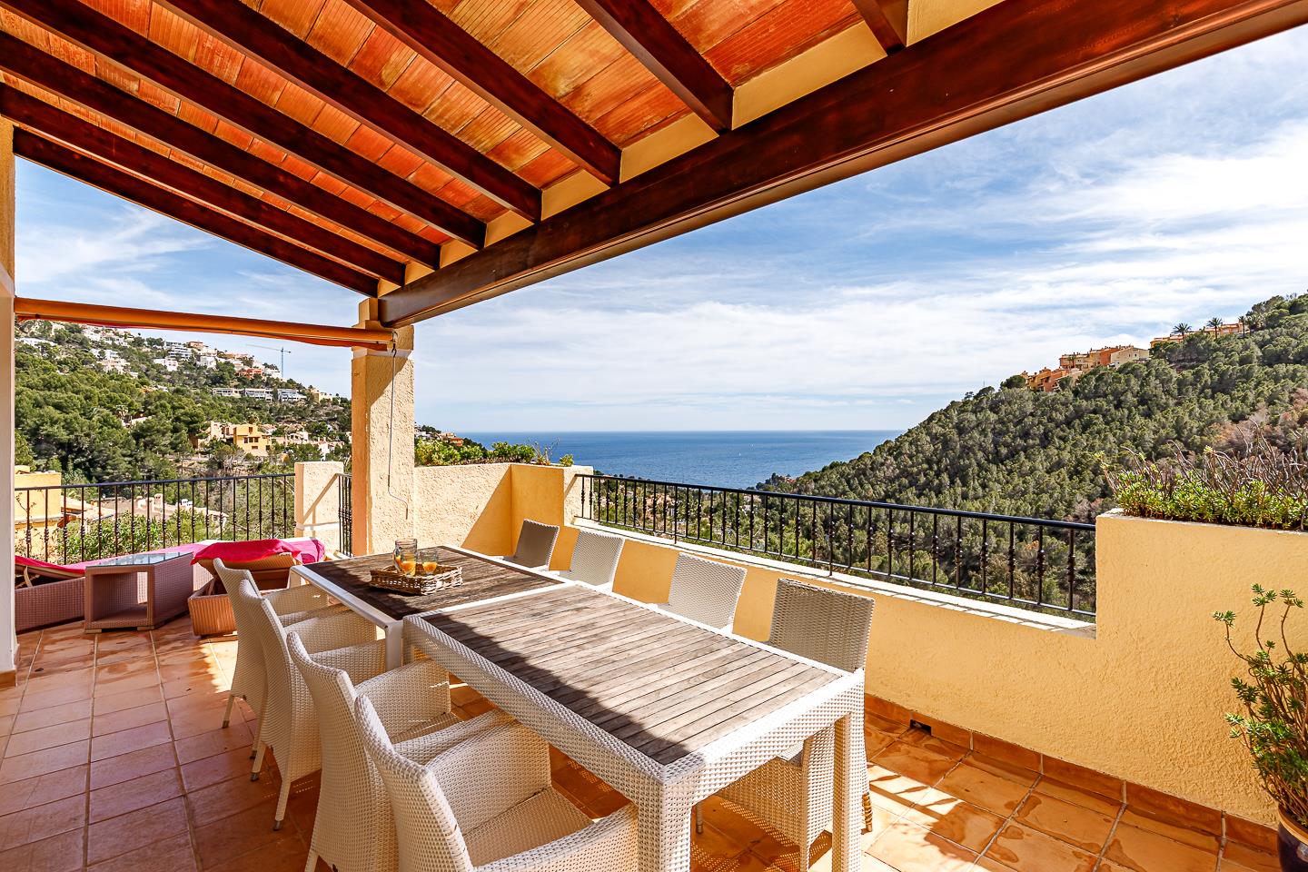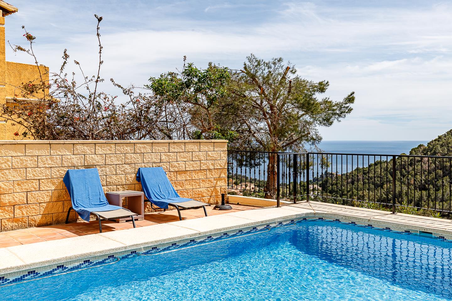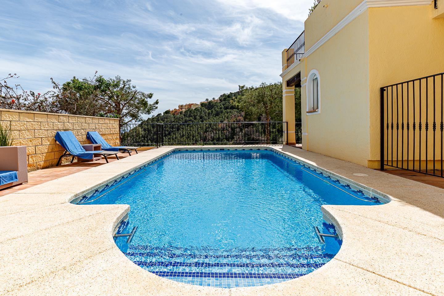 La casa de vacaciones cuenta con 3 dormitorios, 2 baños y 1 aseo de invitados, distribuidos en 2 niveles. El alojamiento ofrece un jardín con árboles, una hermosa piscina y impresionantes vistas de la bahía, el mar y el valle. Su comodidad y la proximidad a la playa y actividades deportivas hacen de este un hogar vacacional encantador para disfrutar de sus vacaciones en España con familia o amigos.