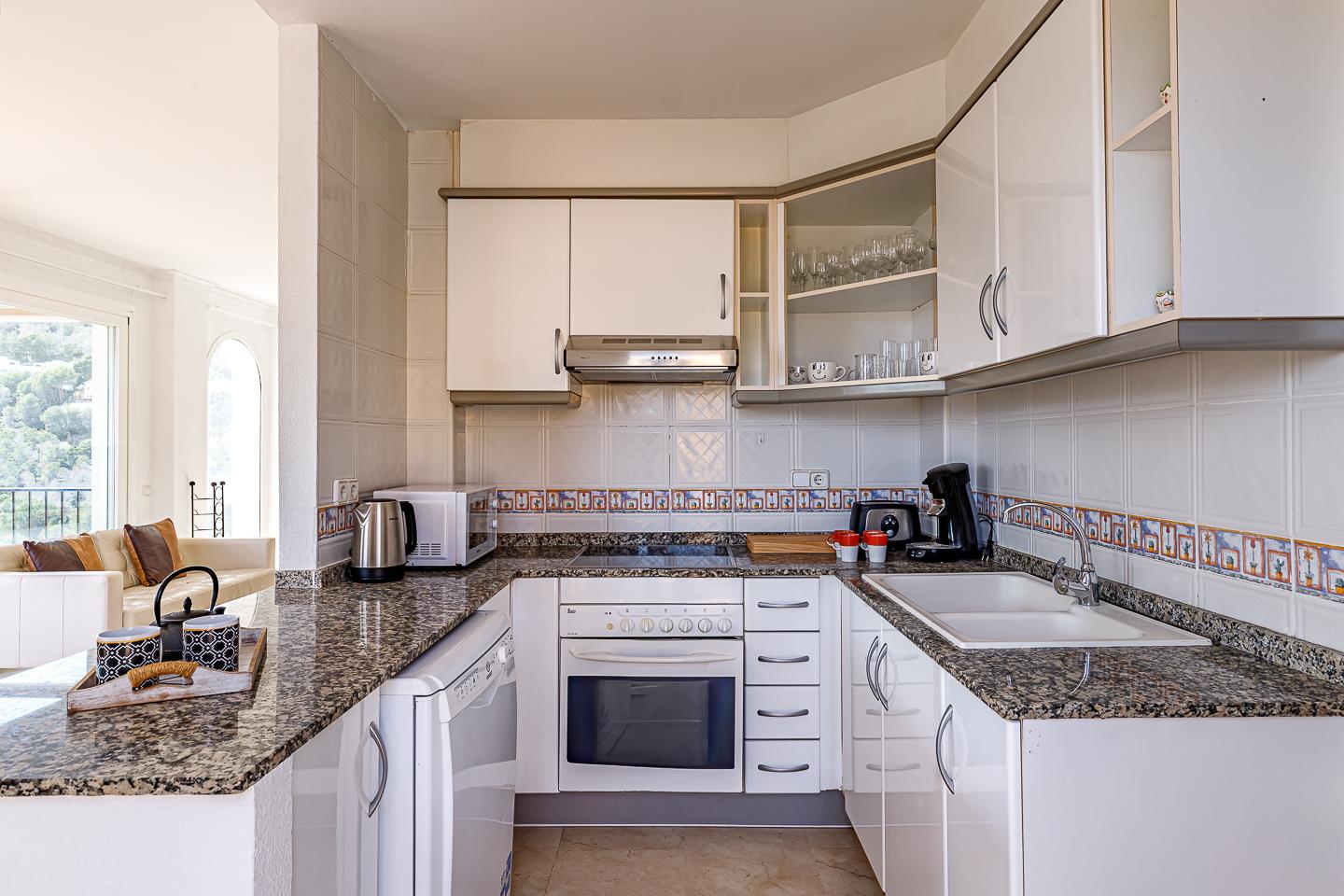 • cocina abierta con placa eléctrica, horno eléctrico, microondas, lavavajillas, nevera-congelador, cafetera, tetera eléctrica, batidora y tostadora