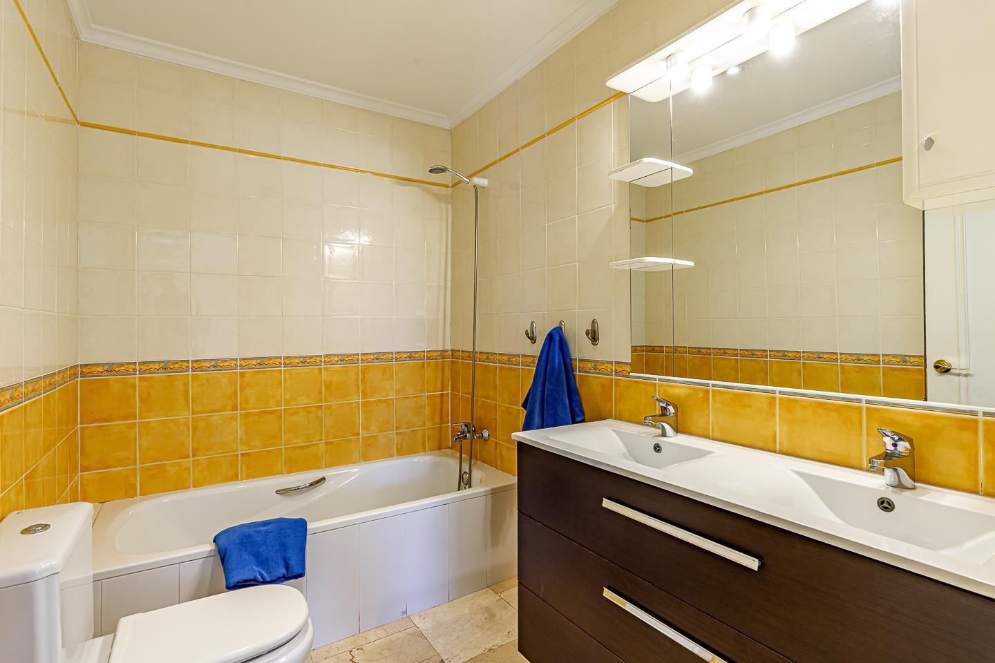 • baño en suite con doble lavabo, bañera/ducha combinada, inodoro y secador de pelo