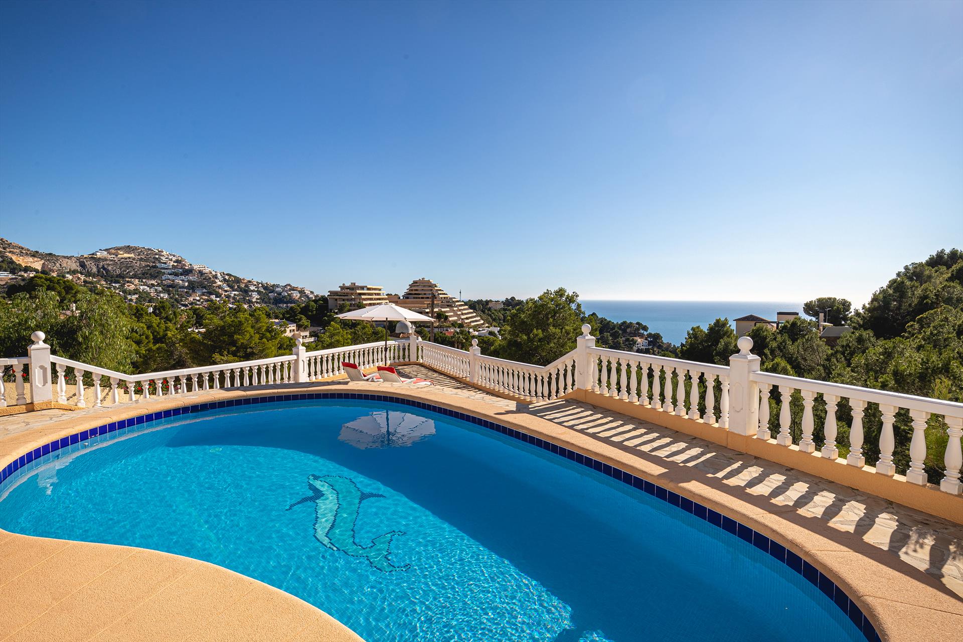 Villa cómoda en Altea, Costa Blanca, España, con piscina climatizada para 6 personas. La casa está situada en una zona residencial, boscosa y montañosa.