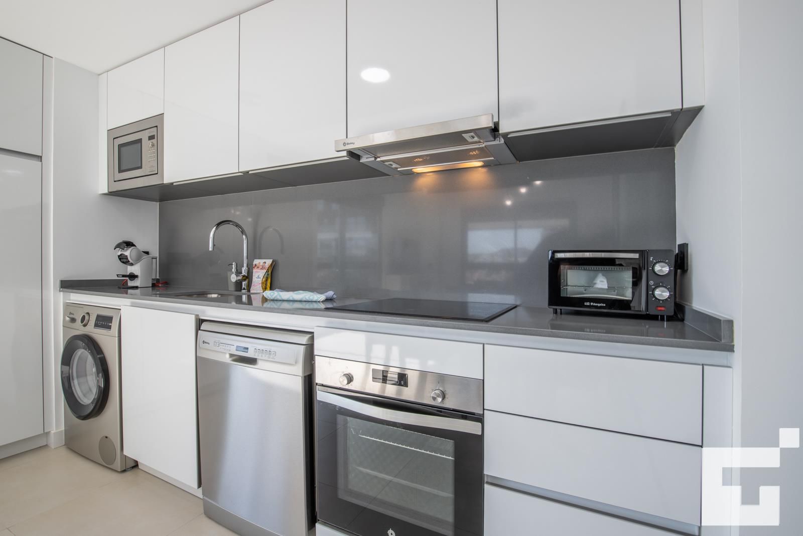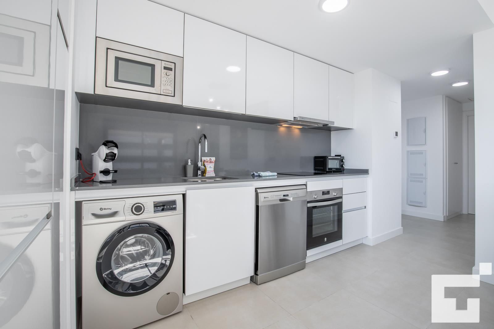 • cocina abierta con placa eléctrica, horno eléctrico, microondas, lavavajillas, refrigerador, congelador, cafetera, tetera eléctrica, batidora, tostadora y exprimidor
