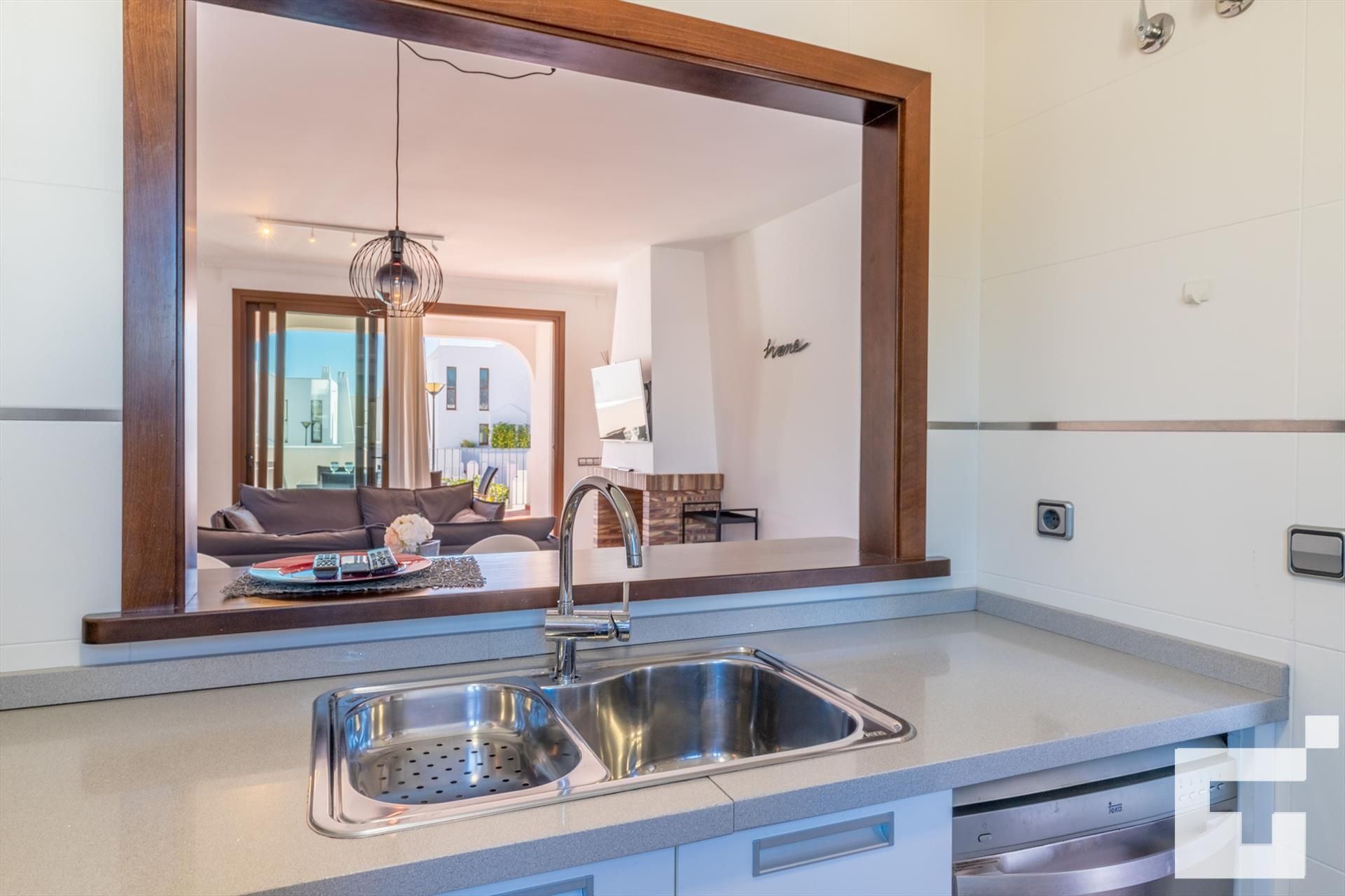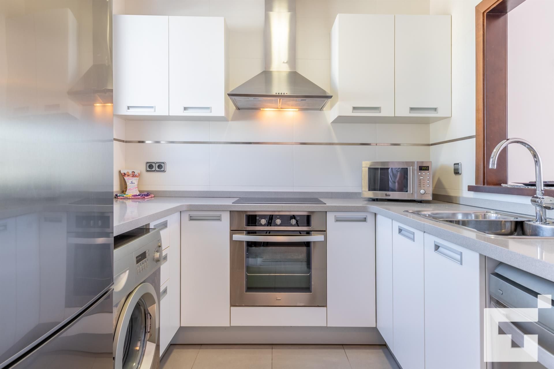 • cocina con placa eléctrica, horno eléctrico, microondas, lavavajillas, refrigerador, congelador, cafetera, batidora, tostadora y extractor de jugo