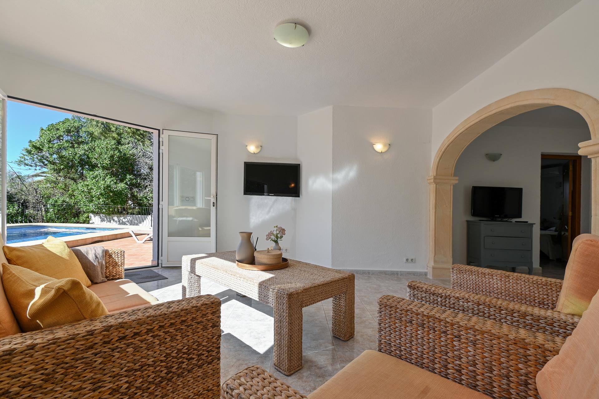 Amplia y cómoda villa en Jávea, Costa Blanca, España, con piscina privada para 8 personas. La casa está situada en una zona residencial de playa, cerca de supermercados y a 3 km de la playa de La Granadella, Jávea.