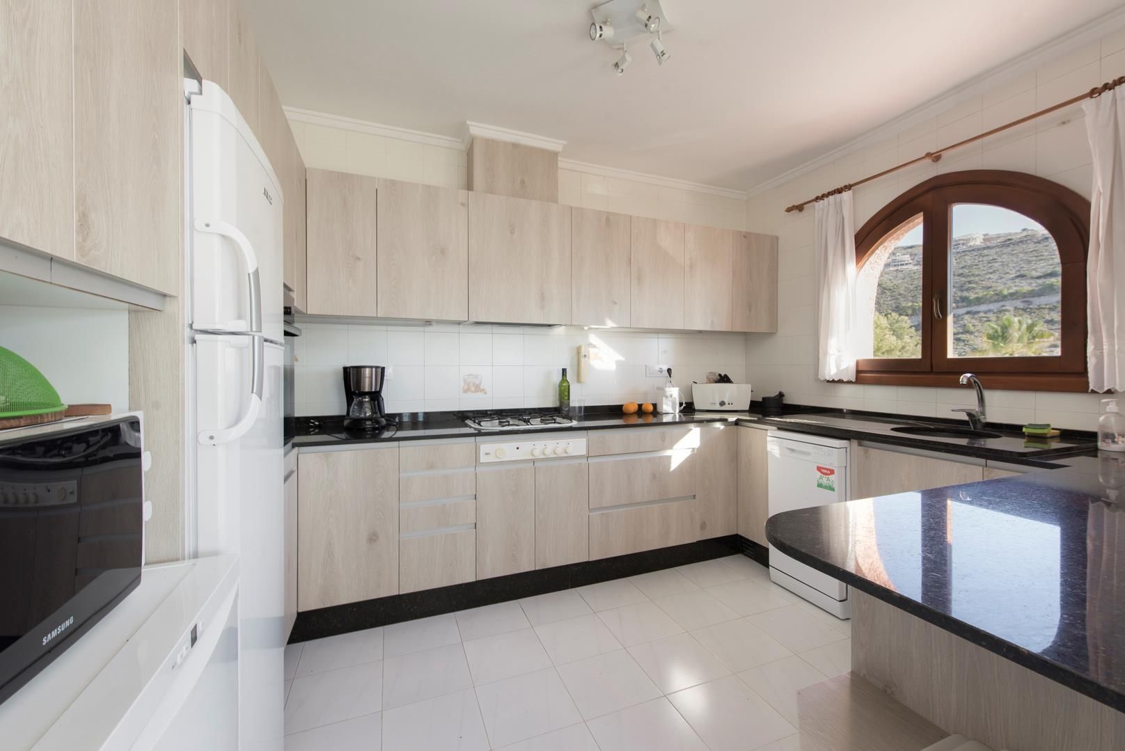 • open kitchen with gas hob, electric oven, microwave, dishwasher, refrigerator-freezer, coffee machine, electric kettle and toaster