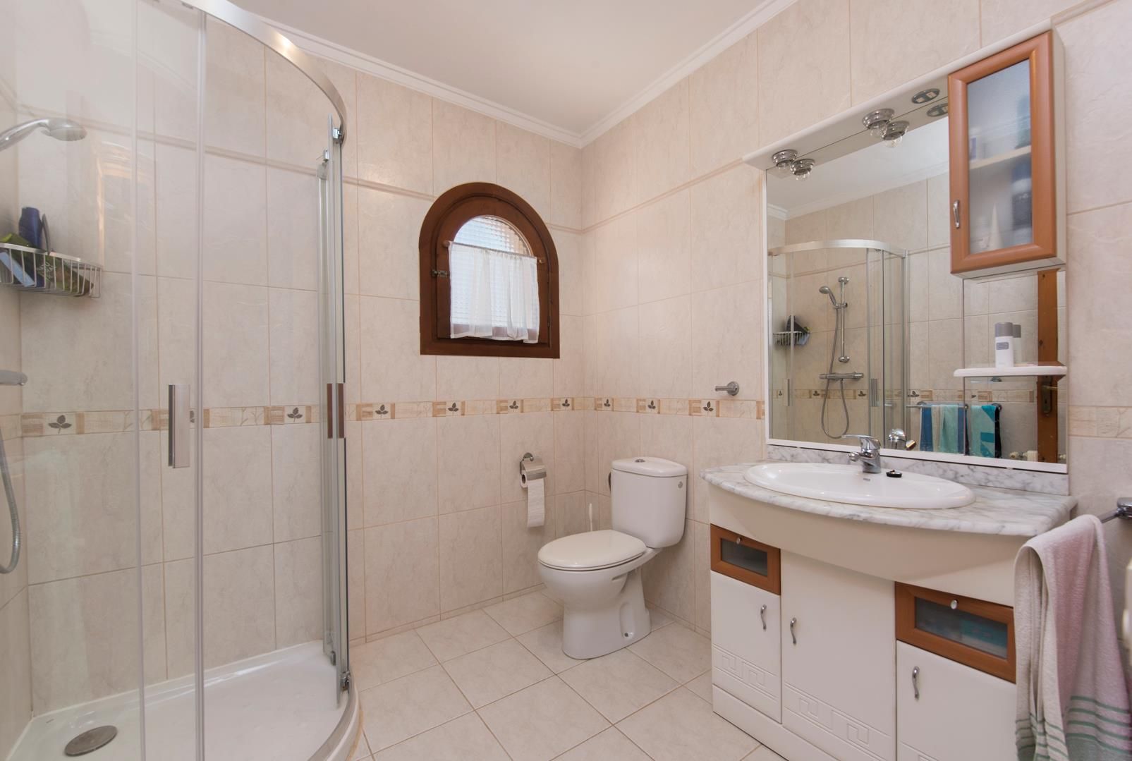 • bathroom with single washbasin, shower and toilet