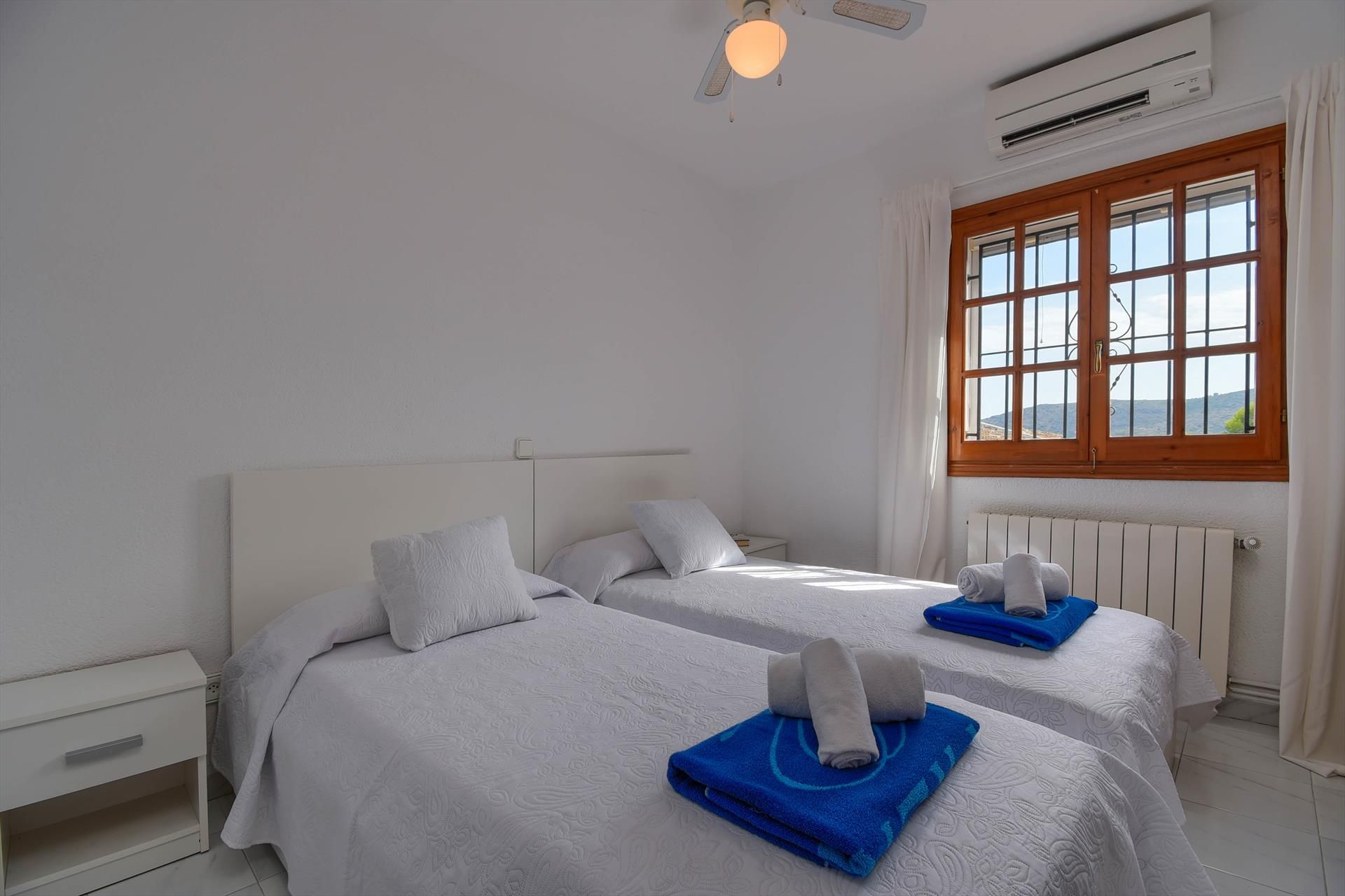 • bedroom with air conditioning, 2 single beds (measuring 190 by 90cm) and fan