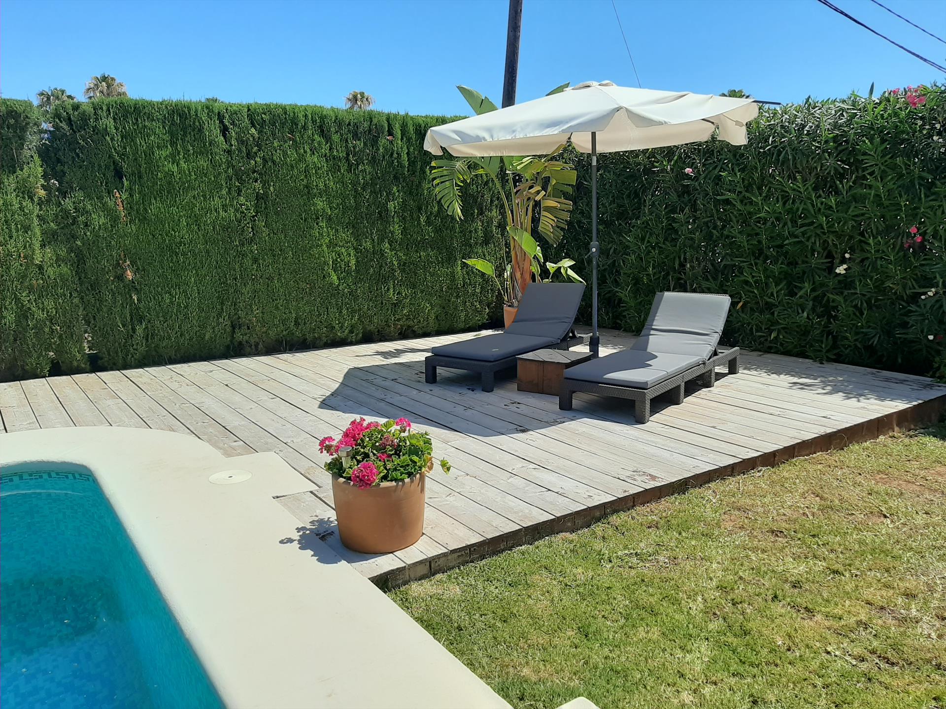 The house has 3 bedrooms and 2 bathrooms. The accommodation offers privacy, a beautiful lawned garden with a beautiful pool. Its comfort and the proximity to the beach, shops, sports activities, entertainment facilities, places to go out, sights and culture make this a fine villa to spend your holidays in Spain with family or friends and even your pets.