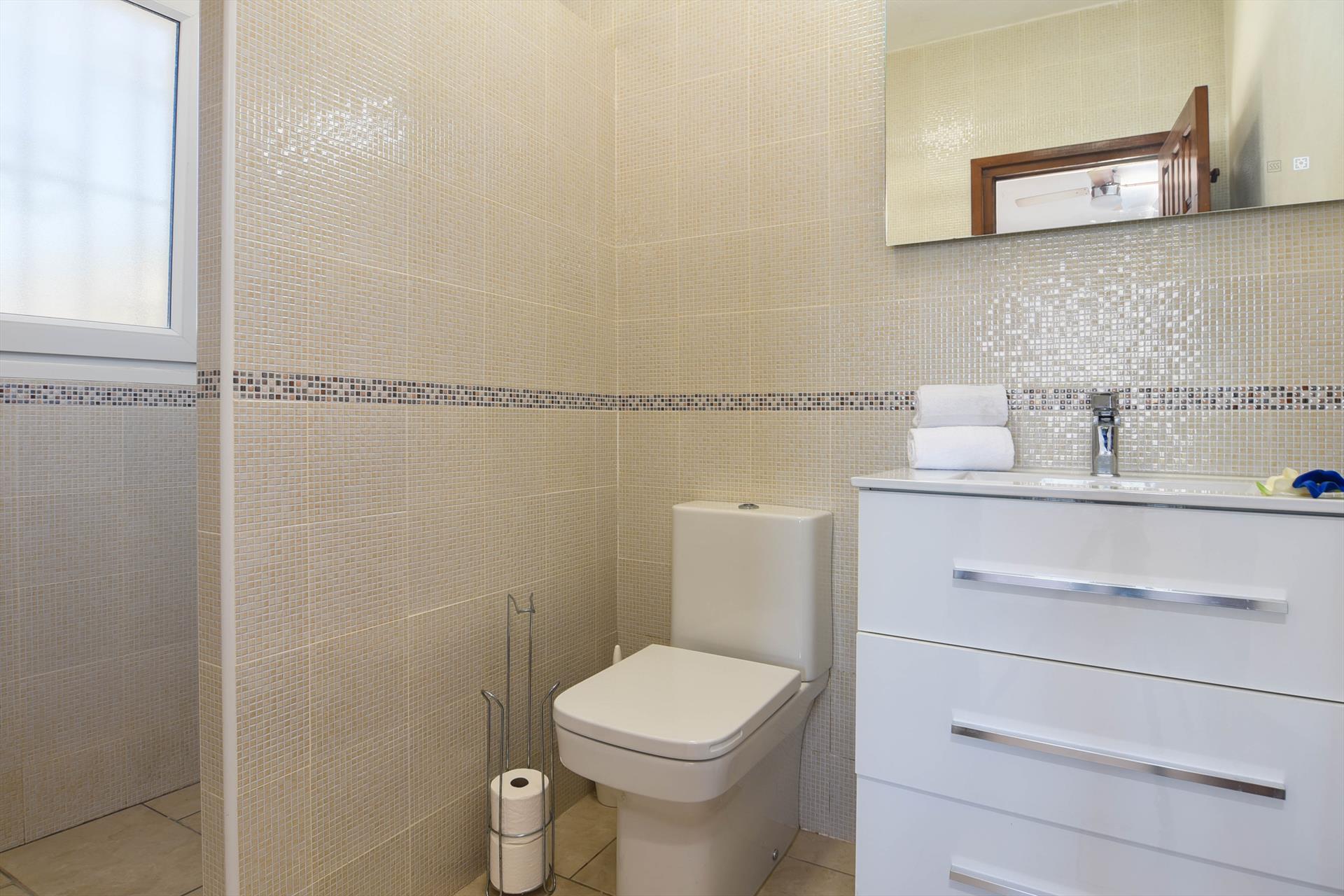 • bathroom with single washbasin, shower and toilet