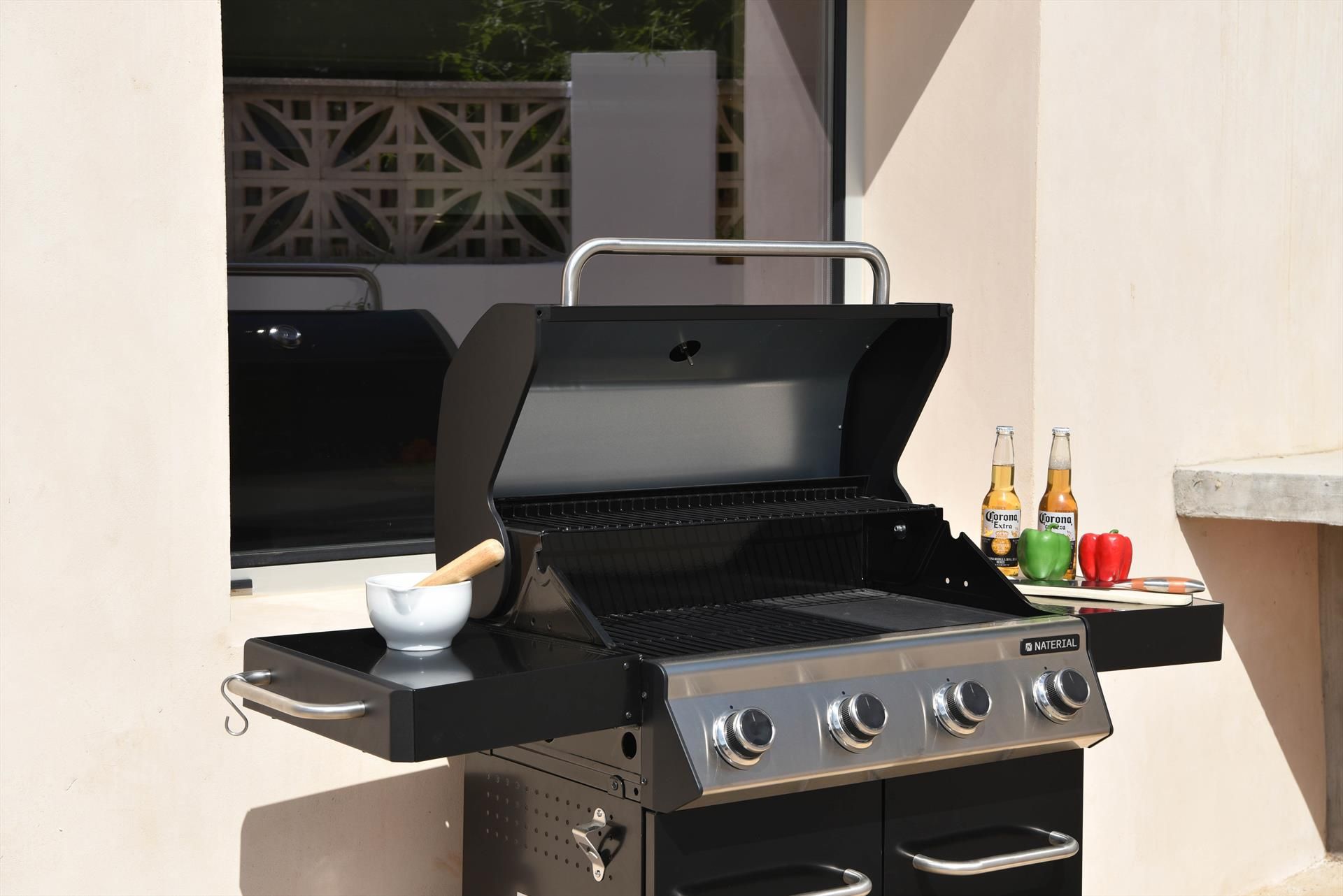 • open kitchen with gas hob, electric oven, dishwasher, refrigerator and freezer, coffee machine, electric kettle, mixer, toaster and juicer