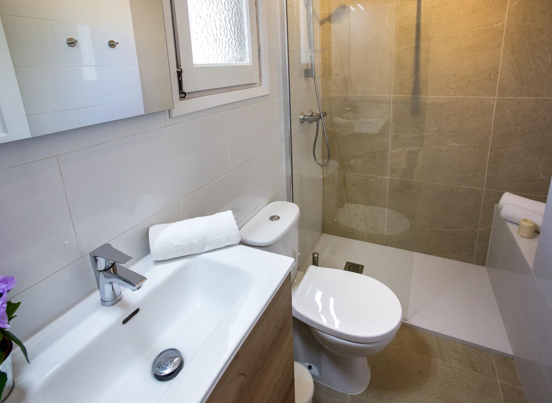 • bathroom with single washbasin, shower and toilet