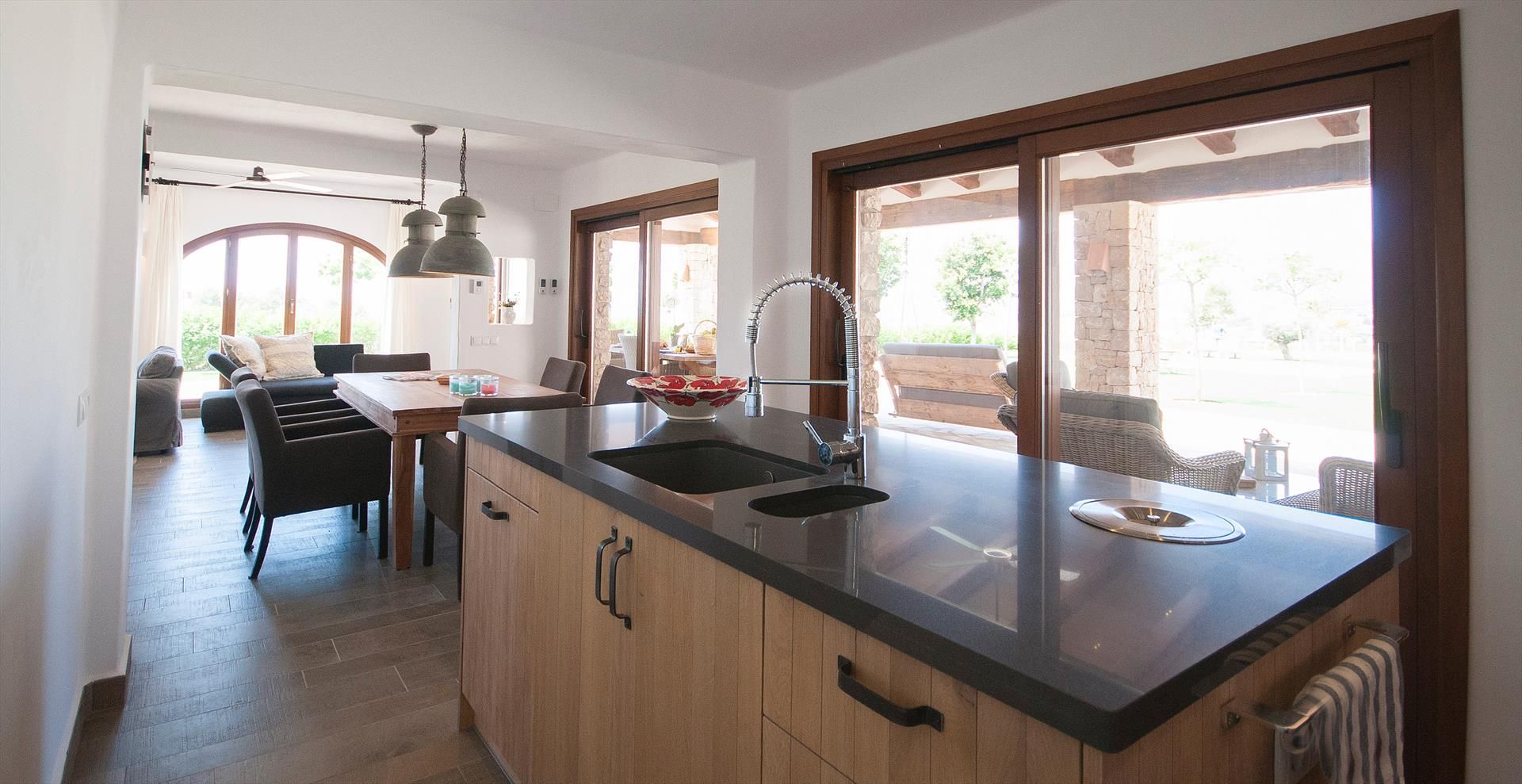 • cuisine américaine avec cuisinière électrique, four électrique, lave-vaisselle, refrigérateur, cafetière électrique, mixeur, grille-pain, presse-citron et fontaine d'eau