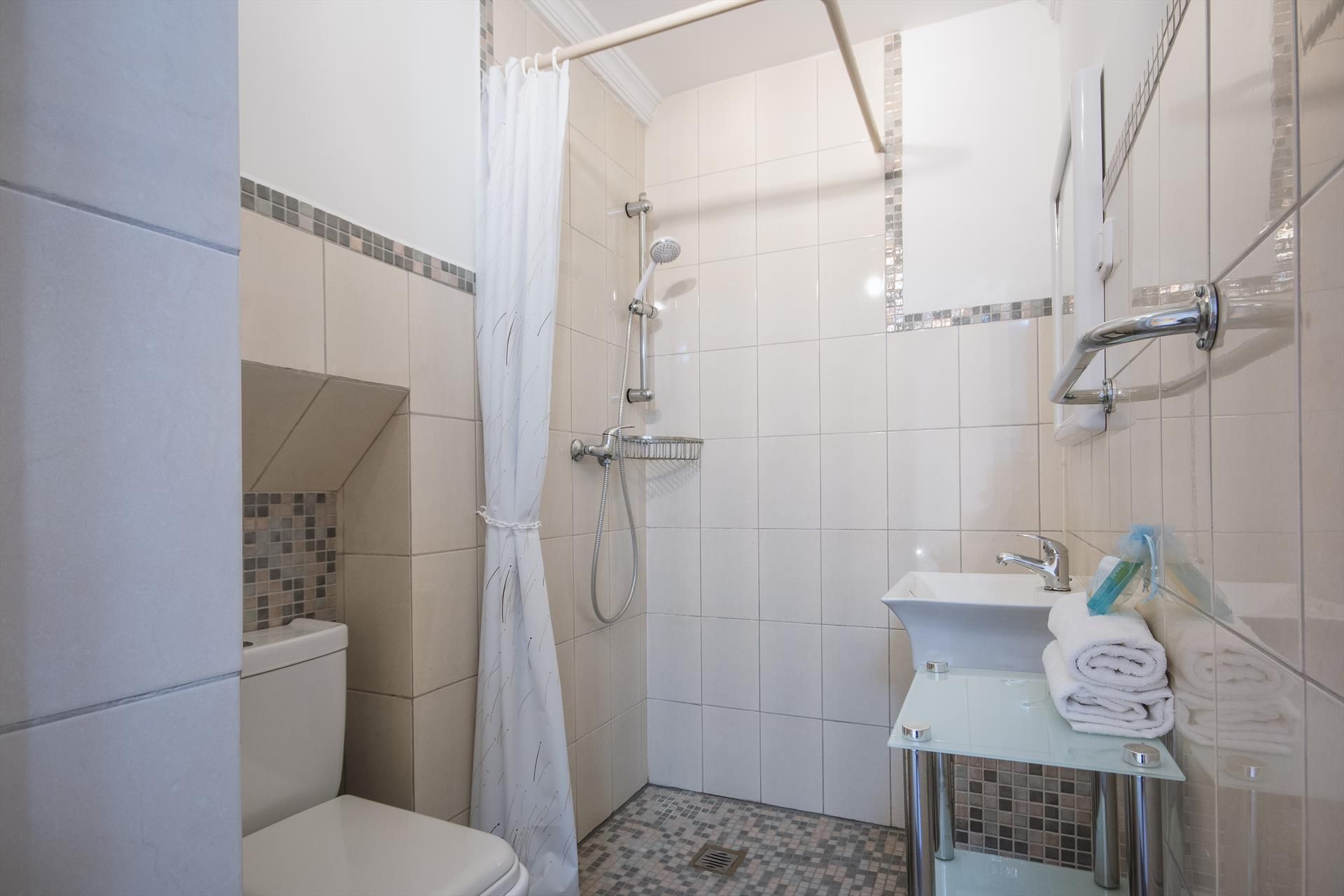 • salle de bains avec lavabo simple, douche et toilettes
