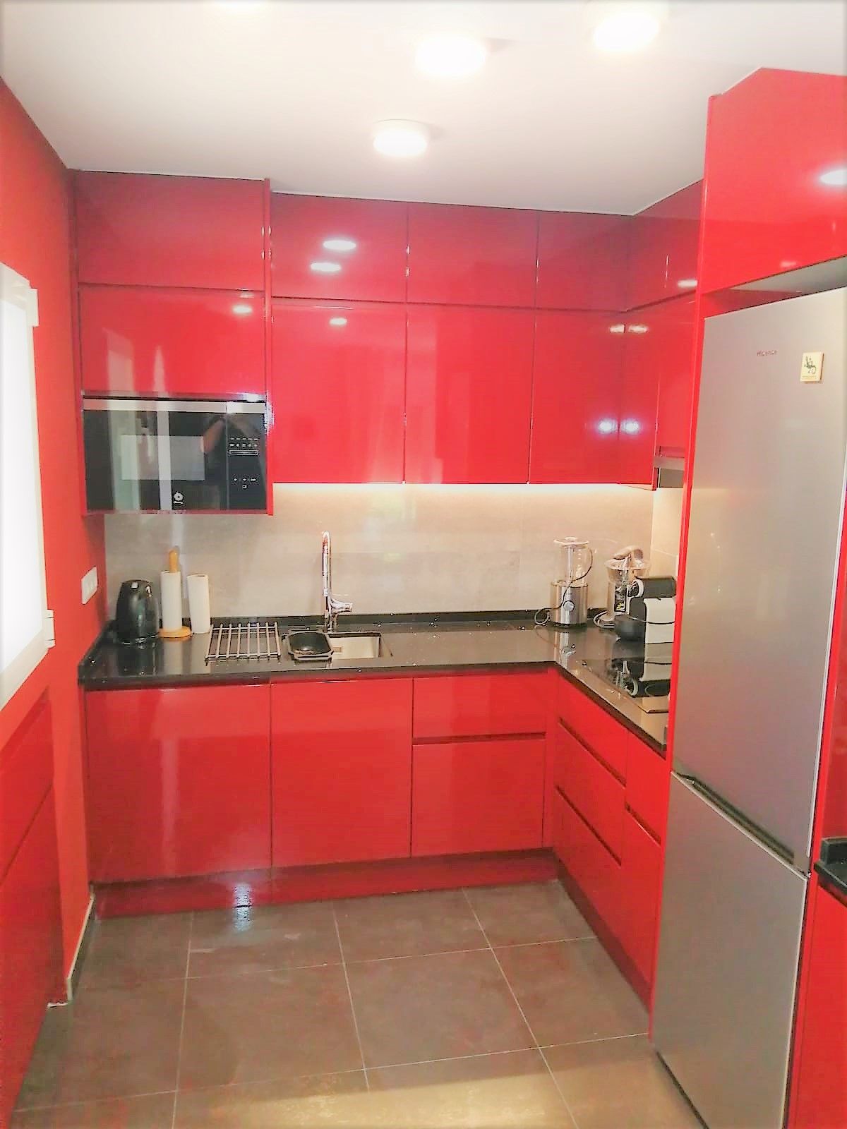 • keuken met elektrische kookplaat, magnetron, vaatwasser, koelkast-vriezer, koffiezetapparaat, waterkoker, mixer, broodrooster en sapcentrifuge