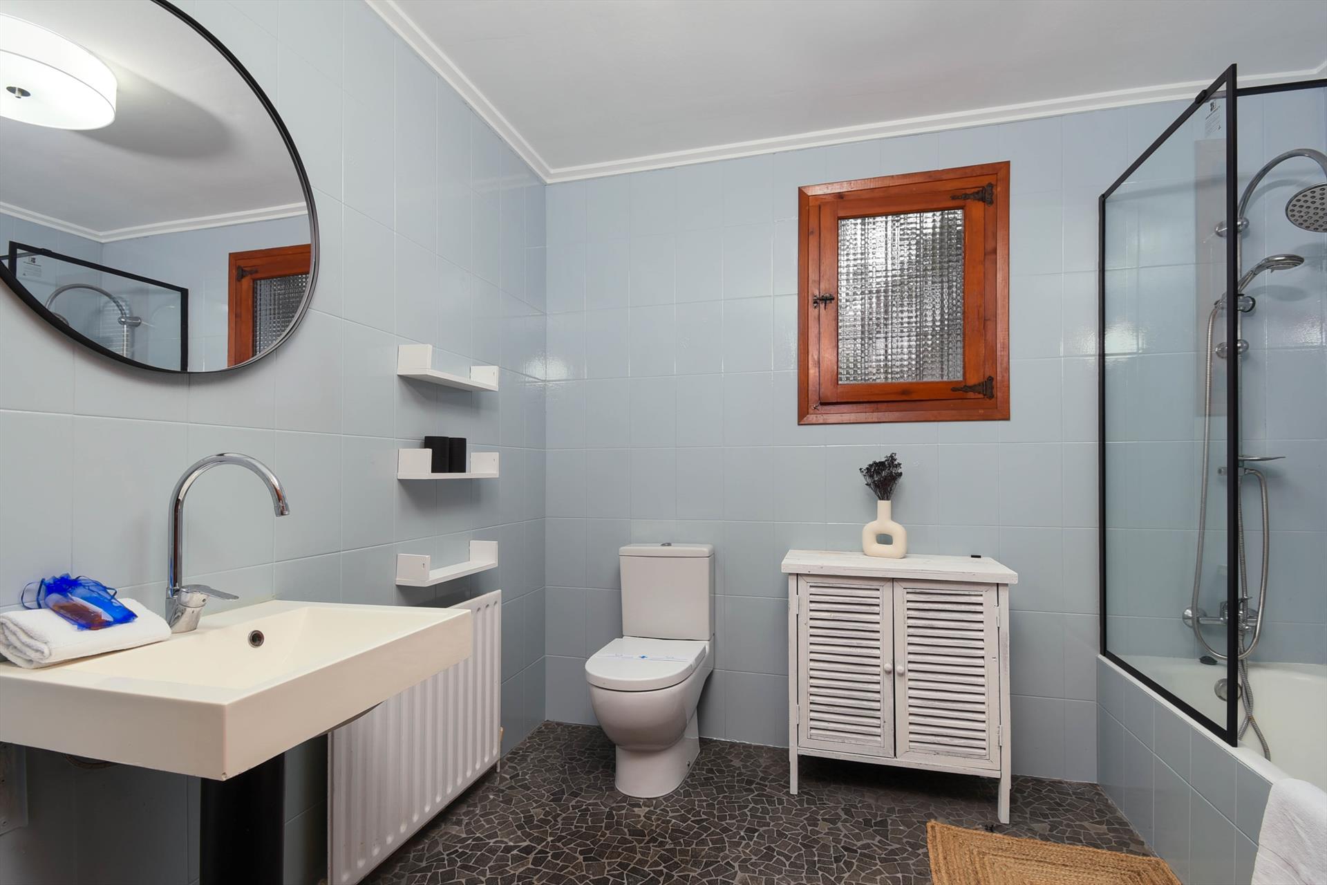 • badkamer met enkele wastafel, bad/douchecombinatie en toilet