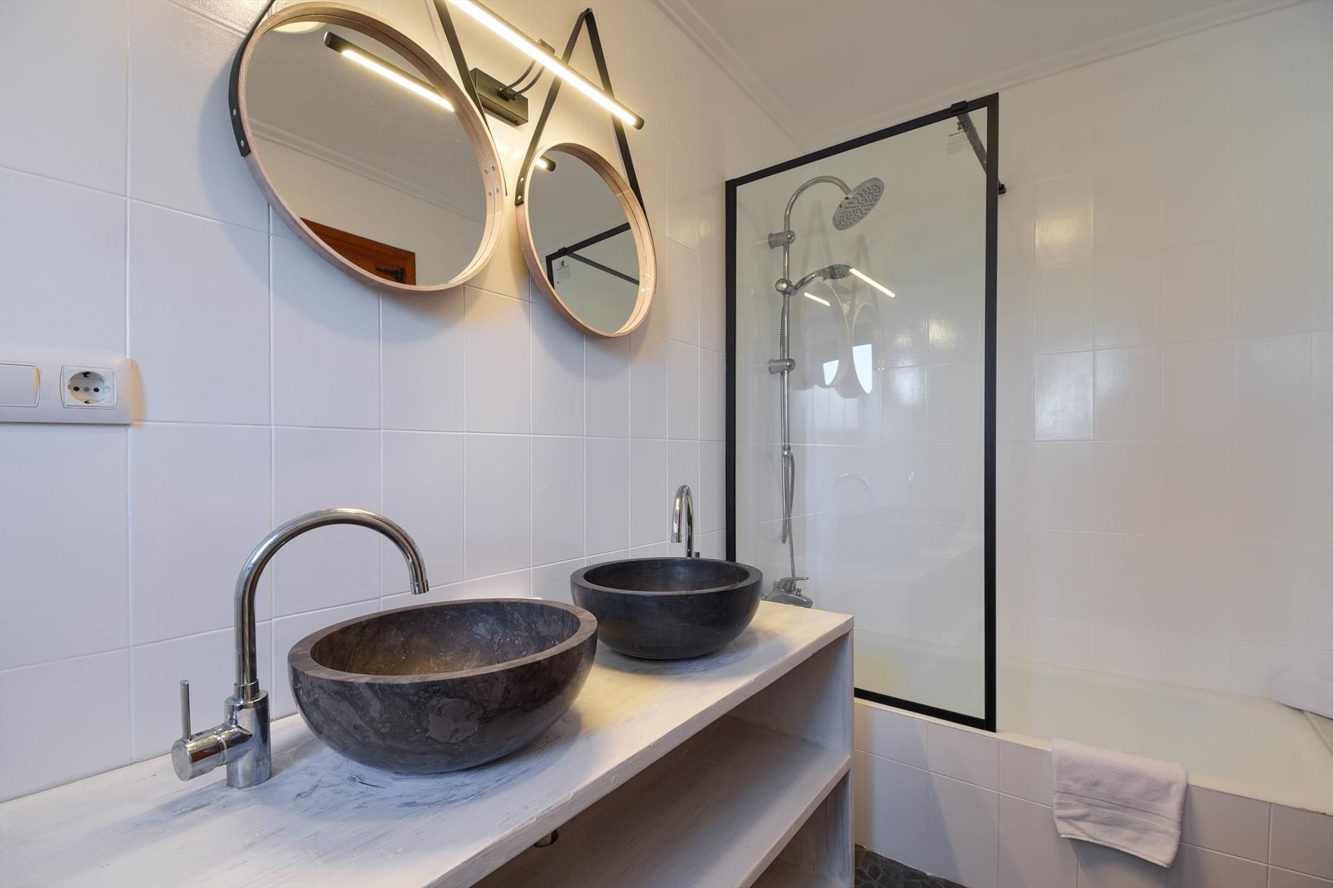 • badkamer met dubbele wastafel, bad/douchecombinatie en toilet