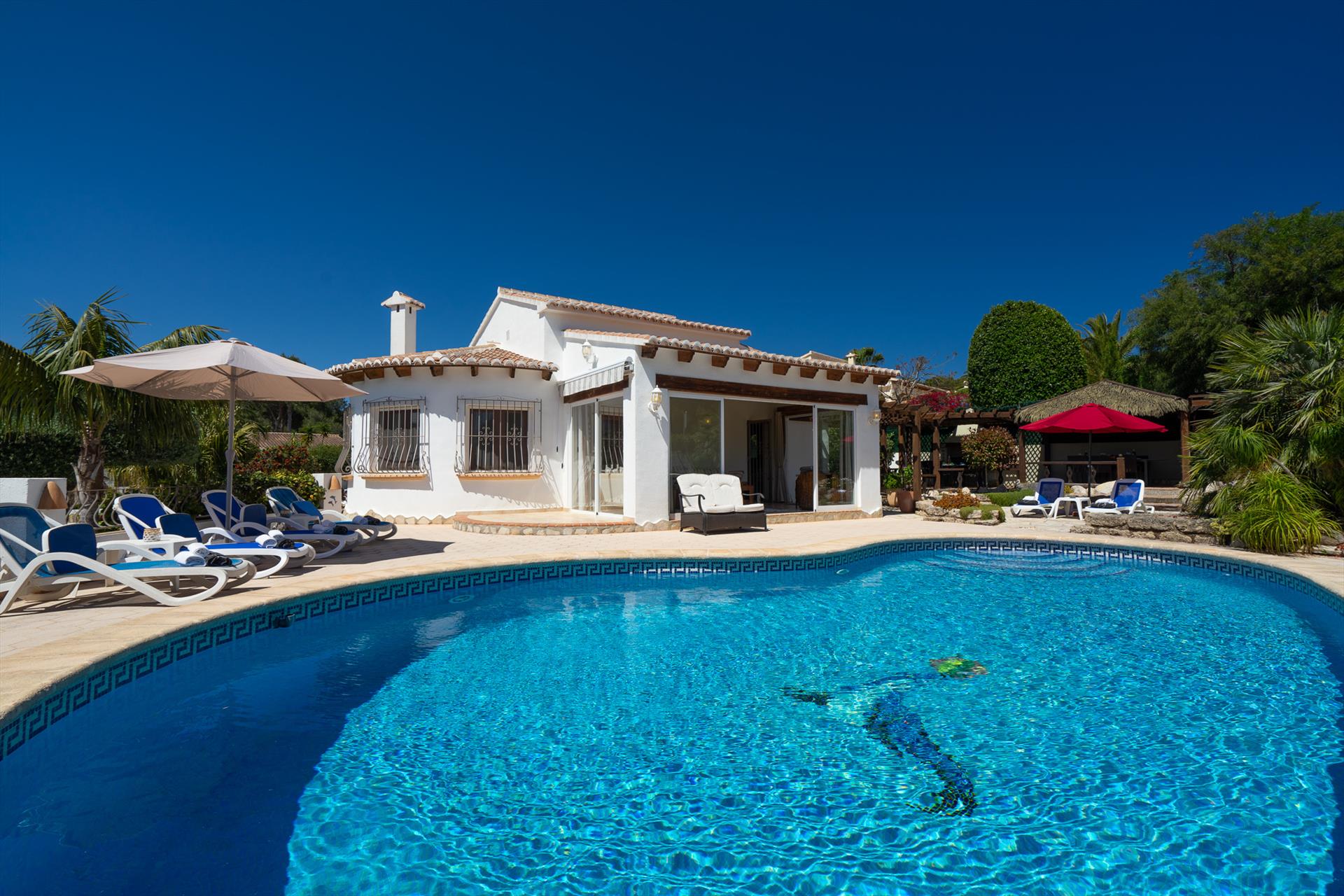 Grote en comfortabele villa met privézwembad in Jávea, Costa Blanca, Spanje, geschikt voor 6 personen. Het huis bevindt zich in een residentiële strandwijk en ligt op 2 km van La Barraca, Jávea strand.